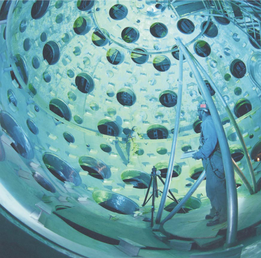 LLNL workers stand inside the 10-meter-diameter target chamber that is the heart of NIF. Lasers entering the chamber will be symmetrically distributed to trigger ignition in a 2-millimeter deuterium–tritium fuel capsule.