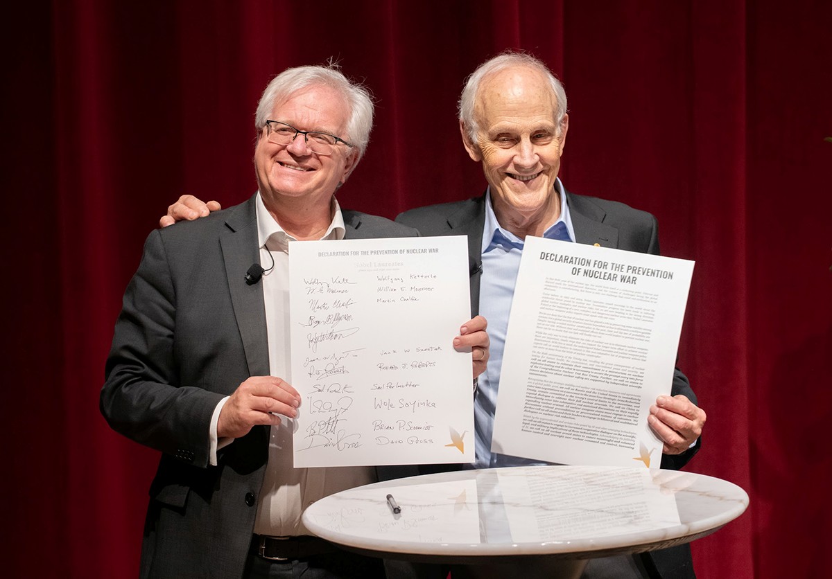 Nobel Prize–winning physicists Brian Schmidt (left) and David Gross (right), along with University of Chicago physicist Daniel Holz, first floated the idea for the recent gathering to address the increased risk of nuclear weapons use. Schmidt and Gross pose with the resulting declaration. (Photo by Jean Lachat.)