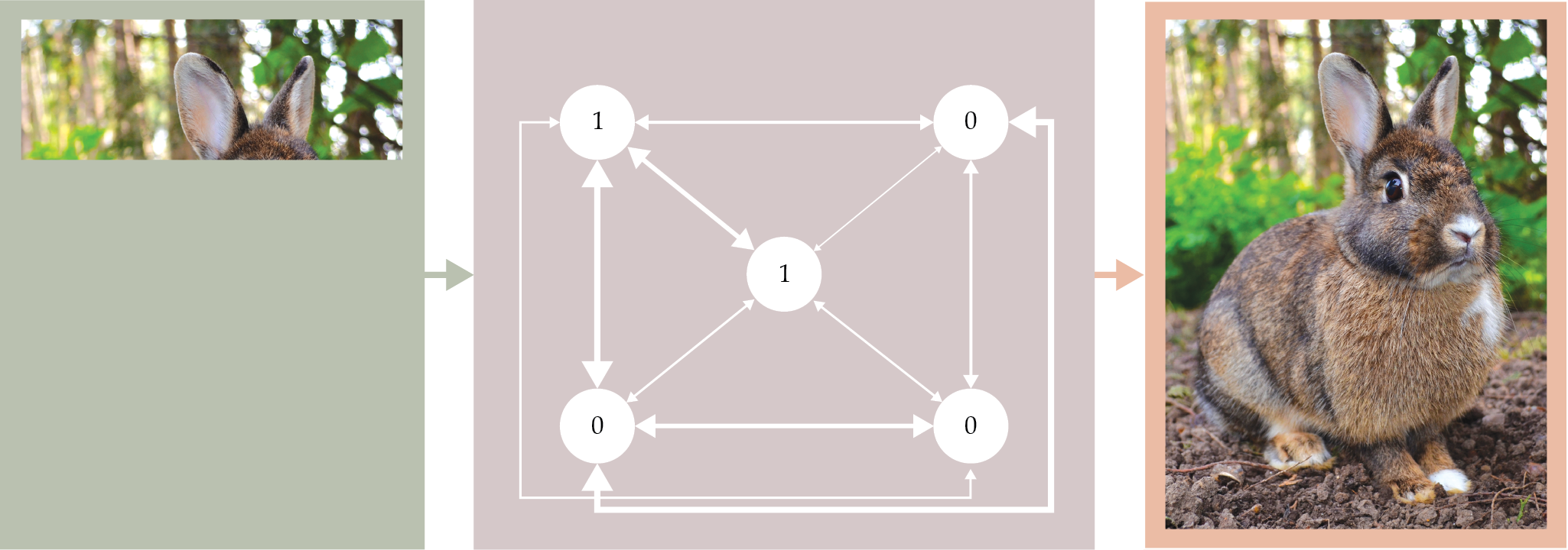 A Hopfield network, formally equivalent to a spin glass, functions as an associative memory: When presented with a partially recalled state, it uses an energy-lowering algorithm to fill in the gaps. The memories are stored in the strengths of the connections among the nodes. When John Hopfield showed that with the right combination of connection weights, the network could store many memories simultaneously, he set the stage for physics-based thinking about neural networks. (Figure by Freddie Pagani; rabbit photo by JM Ligero Loarte/Wikimedia Commons/CC BY 3.0