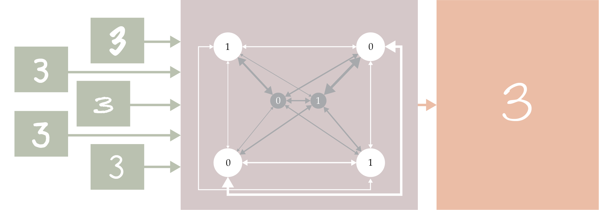 Those are both things that happen in real brains. “It was known experimentally in higher animals that brain activity was well spread out, and it involved many neurons,” says Hopfield. And associative memory is something you’ve directly experienced if you’ve ever recalled a song you’ve heard before after hearing one random line.