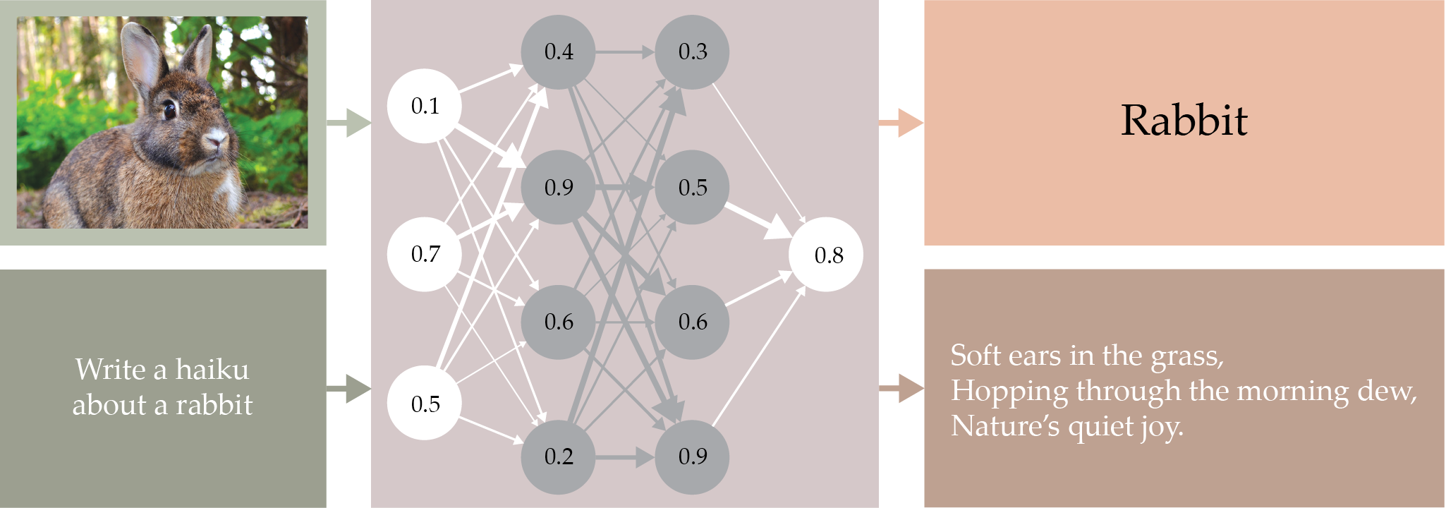 A feedforward network, trained by backpropagation, is the basic structure of the neural networks used today. By passing numerical signals from an input layer through hidden layers to an output layer, feedforward networks perform functions that include image classification and text generation. (Figure by Freddie Pagani; rabbit photo by JM Ligero Loarte/Wikimedia Commons/CC BY 3.0