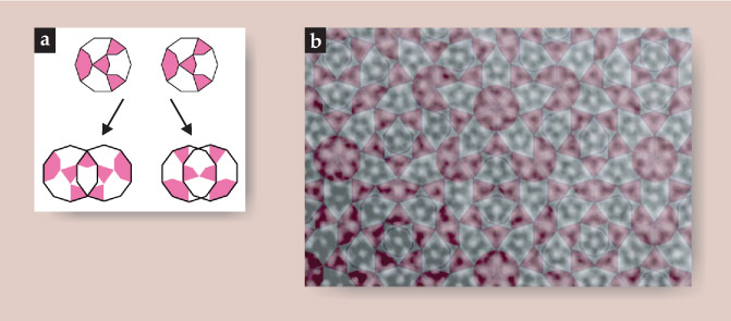 Figure 2. A new order. (a) In a variation of Penrose tiling, neighboring decagonal tiles are allowed to overlap in one of two ways. Maximization of the tiling density then yields a perfect quasiperiodic tiling. (b) Superimposed on a scanning electron microscope image of an Al72Ni20Co8 quasicrystal, the tiling maps to the underlying atomic lattice. Atoms appear as white circles. (Adapted from ref.
