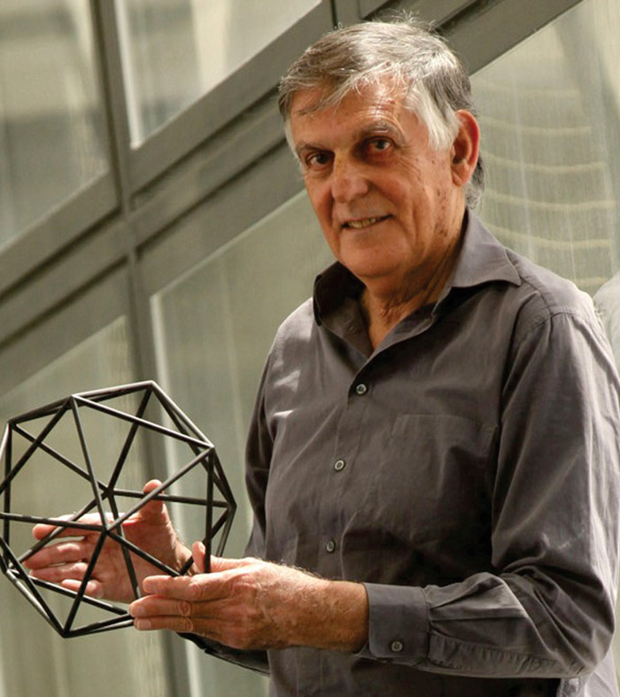 In all, the sample displayed an assortment of symmetries—twofold, threefold, and tenfold—suggestive of an icosahedron, a regular polyhedron having 20 equilateral triangular faces. Icosahedra are actually fivefold symmetric about axes that intersect their vertices, but a diffraction pattern taken along any one of those axes would show tenfold symmetry. (Shechtman is seen holding an icosahedron at left.)