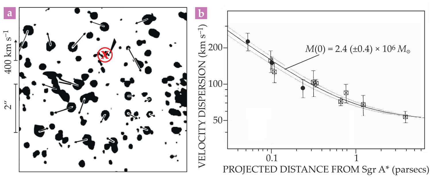 Stars move near the galactic center. (a) Vectors indicate stellar motions in the immediate vicinity of radio source Sagittarius A* (Sgr A*), denoted by the red X, as determined by a four-year survey. (b) A star’s velocity is a function of its distance from Sgr A*. Solid circles indicate the velocity dispersion estimated from stars’ proper motions, the apparent shifts in their positions. Open rectangles indicate velocity dispersion estimated from stars’ line-of-sight velocities. Curves indicate the velocity behavior expected for a single massive point source with 2.4 million M☉. (Adapted from ref.