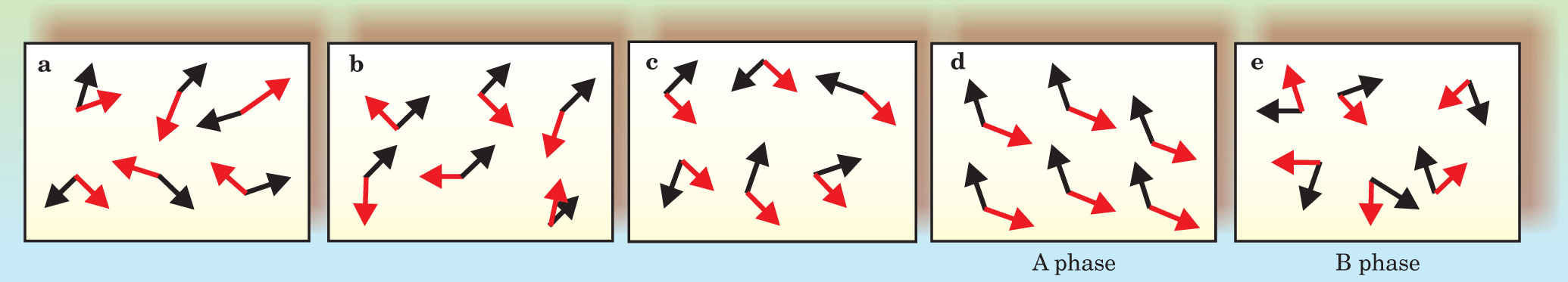 Figure 2. Possible broken-symmetry states in a two-dimensional model of helium-3 atoms with spin (black arrows) and orbital angular momentum (red arrows). (a) Disordered state. (b) State with broken rotational symmetry in spin space. (c) State with broken orbital momentum symmetry. (d) The A phase of 3He. The rotational symmetries in spin and orbital space are separately broken. (e) The B phase of 3He. The broken symmetry is the one governing the relative orientation of spin and orbital momentum.
