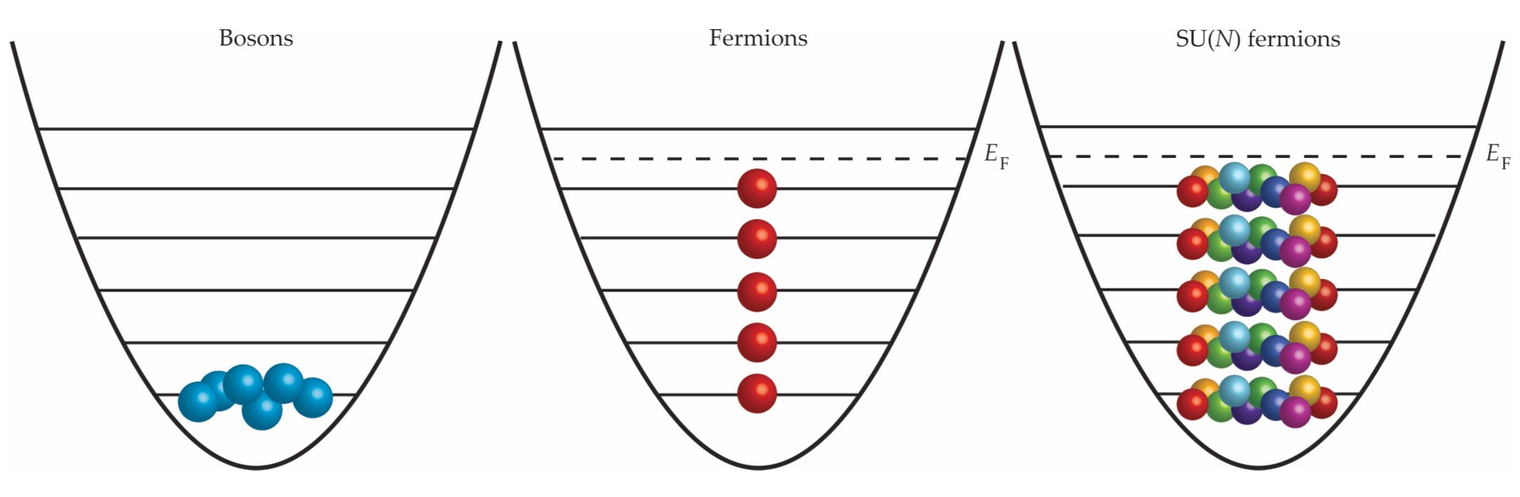 Bosons, fermions, and SU(N) fermions distribute themselves differently in energy levels at low temperatures. Whereas bosons can settle into the same state, fermions stick to separate levels below the Fermi energy EF—unless they have interactions with SU(N) symmetry. Those SU(N) fermions can have N interacting particles in each level. (Adapted from ref. 1.)