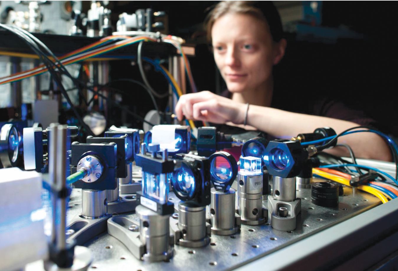 Lindsay Sonderhouse adjusts optical components for the laser-cooling experiment in Jun Ye’s lab at the University of Colorado Boulder. (Photo by Christian Sanner.)