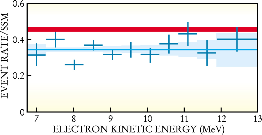 Figure 2. Shortfalls of solar-neutrino-induced v–e elastic scattering at Super Kamiokande (red) and inverse β decay (reaction 2) at SNO (blue) are shown by plotting the observed rates, divided by the standard-solar-model predictions, against recoil electron energy.1 Their difference implies that vµ or vτ contribute to the elastic scattering. The light blue background indicates systematic experimental uncertainties.