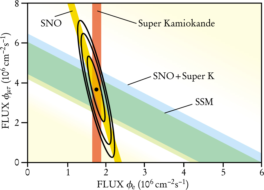 A direct comparison of the SNO and Super Kamiokande data, quite independent of any SSM predictions, translates this discrepancy into the separate flavor fluxes φe and φµτ. In figure 3, the orange and red bands represent the SNO and Super Kamiokande results in terms of these neutrino fluxes. Where they cross, one has a consistent pair of integrated fluxes above the threshold energy. The best fit to the combined data yields a value of 68% for the fraction of electron neutrinos leaving the solar core that arrive at the detectors with their flavors changed either to vµ or vτ. The data do not distinguish between vµ and vτ.