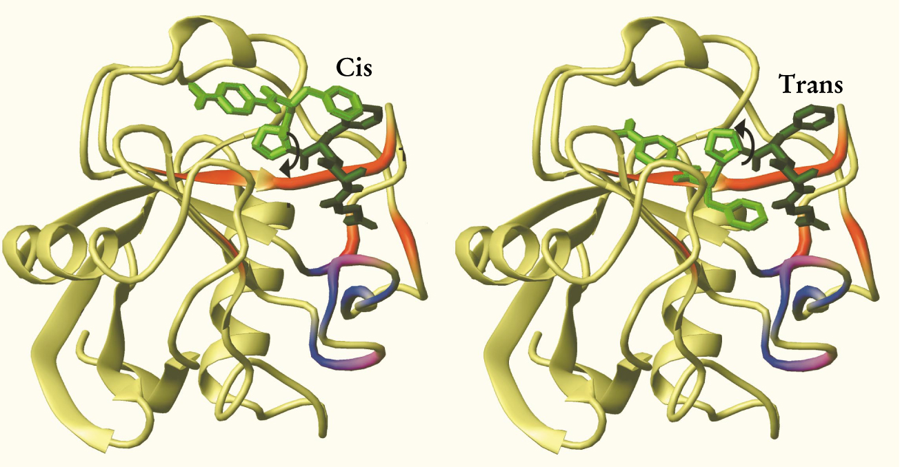 The NMR data distinguish between binding and catalysis, but can’t reveal the difference between cis and trans binding because both are present in the lab samples at the same time. Fortunately, in 1996, Yingdong Zhao and Hengming Ke of the University of North Carolina at Chapel Hill derived the crystal structure of CypA bound to the cis—and only the cis—isomer of a peptide. Armed with Zhao and Ke’s structure, Kern could deduce by elimination which of the binding amino acids move when they lock onto the trans isomer.