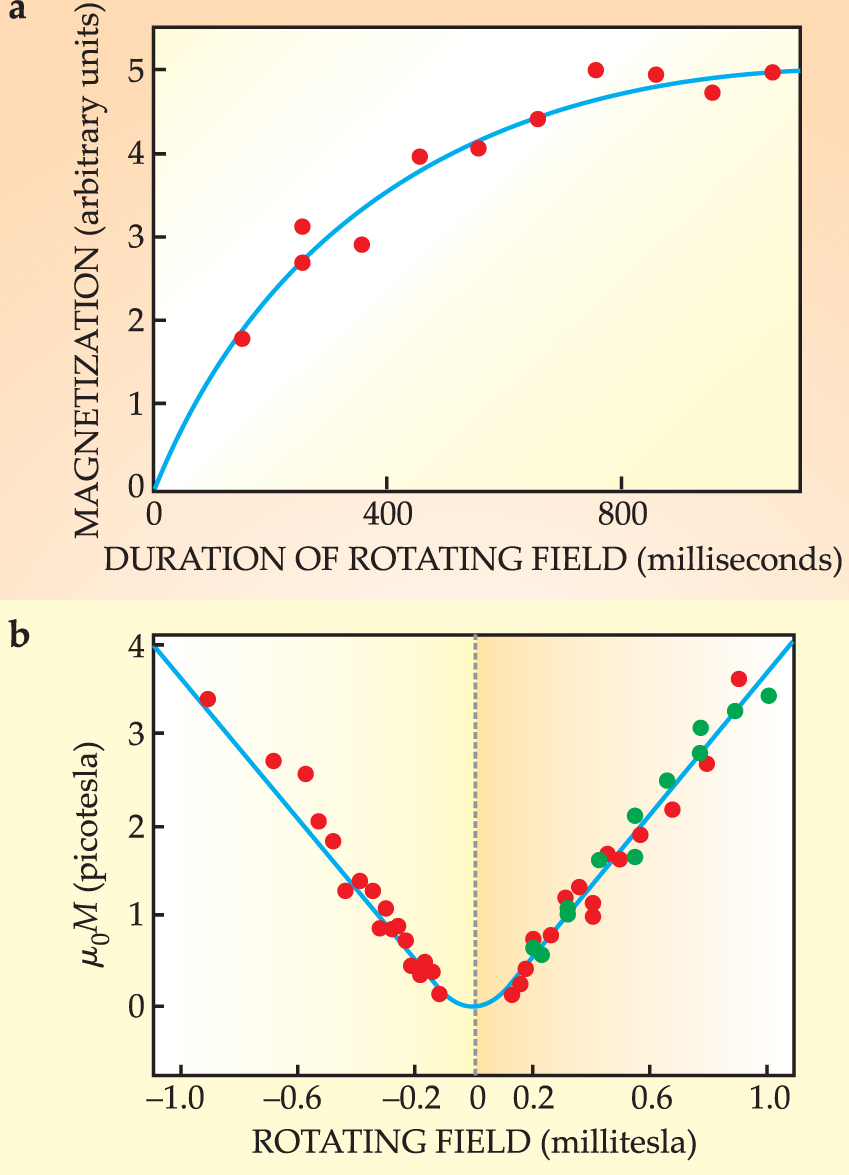 Serendipitously, one of the people involved in the earliest experiments on electron spins in rotating fields—Erwin Hahn—is at Berkeley, where he sometimes collaborates with researchers who have developed superconducting quantum interference devices capable of detecting picotesla fields. Hahn recently joined with two such SQUID experts, Seung-Kyun Lee and John Clarke, to measure—at long last—the static magnetization induced in nuclear spins by a rotating field.
