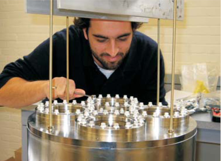 Geoffrey Smith, a microbiologist at New Mexico State University, Las Cruces, heads up studies on the effects of radiation on cells. Cell growth is being compared under three different radiation exposures—a reduced level underground at WIPP, a surface level, and a slightly elevated level. “These are not levels we know as harmful,” Smith says. “The point is to get data to test the linear no-threshold hypothesis.” For two types of bacteria, Smith and his group track cell growth, protein production, and absorbance of the cell culture media. For the underground tests, Smith says, “the cells experience unnaturally low radiation levels because they are grown in a chamber made from 7-inch-thick, pre–World War II steel, which does not have radiation fallout from atomic bombs.” From the first round of experiments last summer, he says, “it looks like cells may not be doing as well underground, but it’s not statistically different from aboveground.” He plans another round of experiments this summer. Smith is also involved in other research in WIPP that doesn’t require low radiation levels, namely, the search for 250-million-year-old bacteria in saturated-brine inclusions.