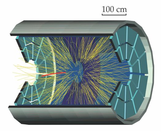 Observing antimatter helium-4. When relativistic heavy nuclei collide, they fleetingly interact to produce hot, dense matter—often interpreted as the quark–gluon plasma—containing roughly equal numbers of quarks and antiquarks. As the matter cools, it changes phase to a hadronic gas that includes nucleons and their antiparticles. And those antinucleons, when close enough in position and momentum, can form a stable bound state. The STAR collaboration, a team of hundreds of scientists from 54 institutions worldwide, has now found evidence for antihelium-4 in the debris created in high-energy collisions at Brookhaven National Laboratory’s Relativistic Heavy Ion Collider. Consisting of two antiprotons and two antineutrons, 4He― is the heaviest antinucleus yet detected. The experiment’s central detector, situated in a solenoidal magnetic field, is used to image the ionization trail left by charged particles and antiparticles as they traverse a gas-filled chamber. From measurements of the energy loss and the time of flight for the antiparticles to reach a secondary detector composed of 23 000 sensors, the collaboration unambiguously identified 18 4He― nuclei in a sample of 1012 tracks from a billion gold-on-gold collisions; the figure shows the tracks, including one (red) from a 4He― nucleus, for a typical event. The yield is consistent with expectations from thermodynamic and nucleosynthesis models and provides a benchmark for any future observations of 4He― , or even heavier antimatter nuclei, from cosmic radiation. (