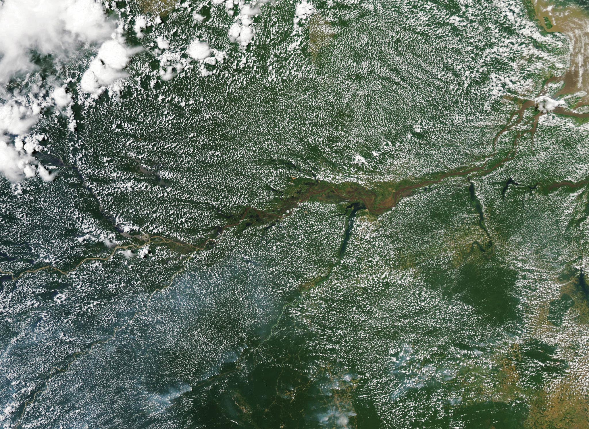 Small clouds pop up over Amazon forestland in this 2019 image from NASA’s Aqua satellite. (Image by Lauren Dauphin/NASA Earth Observatory.)
