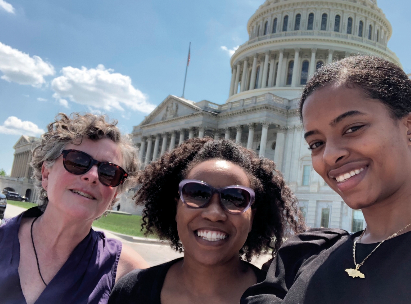 Talea Mayo (center), an assistant professor at the University of Central Florida, runs a spinoff of the Significant Opportunities in Atmospheric Research and Science (SOARS) program. Her first recruit was Cindi-Ann Findley (right). In 2018 they presented their computational work on the nonlinearities of tides and hurricane storm surges at an NSF event on Capitol Hill, where they posed with Karen Saxe of the American Mathematical Society.
