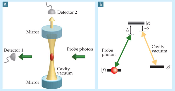 In the MIT approach, a weak probe pulse shines on a cloud of Cs atoms from the side, as illustrated in figure 1. The mirrors’ ultrahigh reflectivity traps scattered photons in the cavity, which amplifies their electric field, guarantees strong coupling, and thus ensures that incoming photons are most likely to scatter into a single mode of the resonator. Indeed, that was Field’s original prediction: In the strong-coupling regime, fluctuations in the electromagnetic vacuum field are sufficient to induce transparency in the atoms—no control beam required—an effect that’s been dubbed vacuum-induced transparency (VIT). Without the vacuum field of the cavity, spontaneous emission from an excited state would send a scattered photon in some random direction where it would be lost in space.