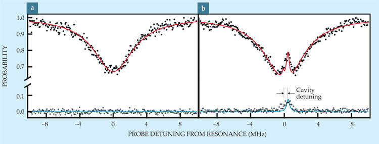 The signature event in VIT, shown in figure 2, is the emergence of a narrow increase in the light transmission when the probe-photon and cavity-vacuum frequencies are both in or near resonance with the two ground state–excited state transitions (figure 1). At those resonance frequencies, the probe absorption and cavity-mode absorption destructively interfere. Crucially, and unlike in EIT, a probe pulse plays dual roles and creates its own transparency: After being absorbed by the atom cloud, a probe photon scatters into the cavity mode, and its reabsorption in that mode by the cloud of atoms renders the cloud transparent to the same probe photon. Eventually, the photon is converted back into the probe pulse, which then exits the system and is detected.
