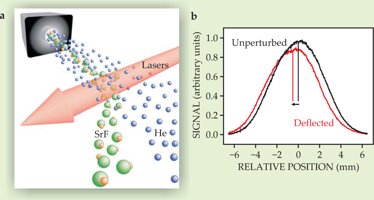 The researchers tested their scheme by irradiating a SrF molecular beam (cooled to 4 K with a buffer gas of helium) from one side, as shown in figure 2(a). By measuring the light produced when the molecules reemitted their absorbed photons, they estimated that each SrF molecule undergoes about 150 cycles. That estimate was confirmed by the deflection of the molecular beam, as shown in figure