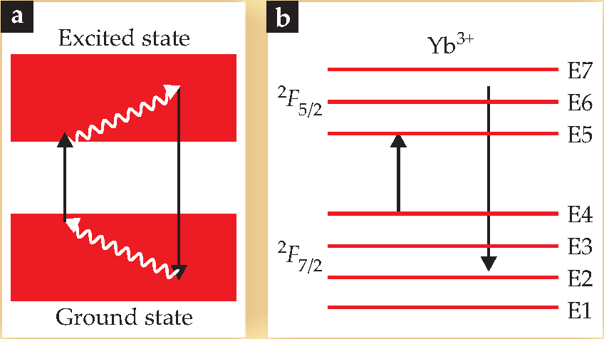 So far, every demonstration of optical refrigeration has used a transparent material doped with a rare-earth element—usually ytterbium, but some studies have used thulium and erbium. The surrounding atoms split the dopant ions’ two lowest-energy states into several sublevels, as shown in figure