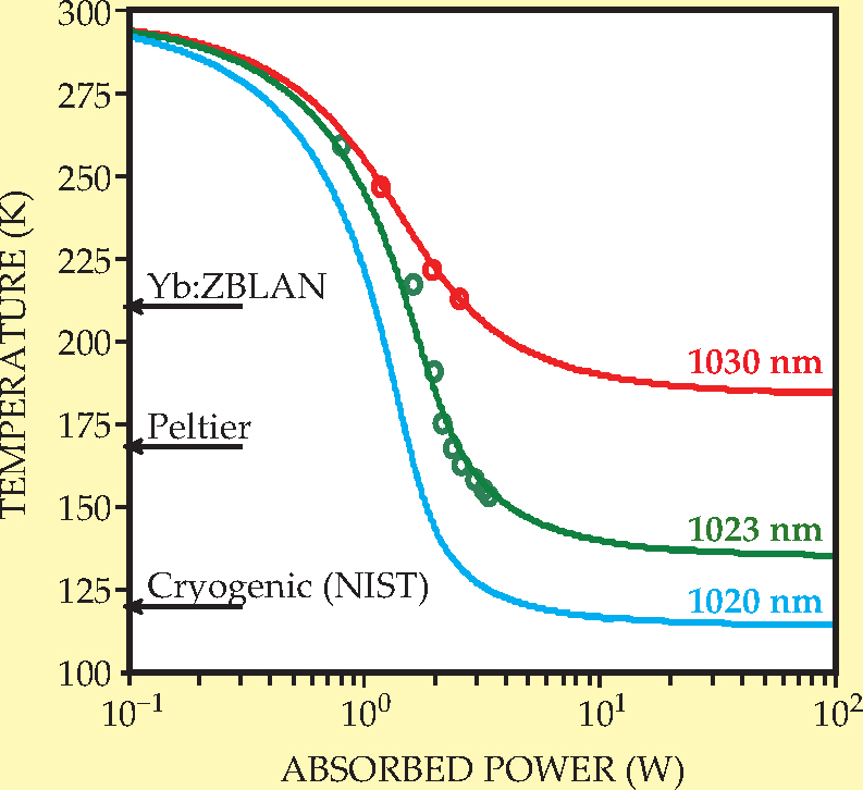 Now researchers led by Mansoor Sheik-Bahae of the University of New Mexico in Albuquerque and Mauro Tonelli of the University of Pisa in Italy have set an optical refrigeration temperature record. 1 They’ve cooled a solid sample of Yb-doped yttrium lithium fluoride (Yb:YLF) from room temperature to 155 K—about 10 degrees colder than can be achieved by standard thermoelectric Peltier coolers, previously the best-performing all-solid-state cooling system.