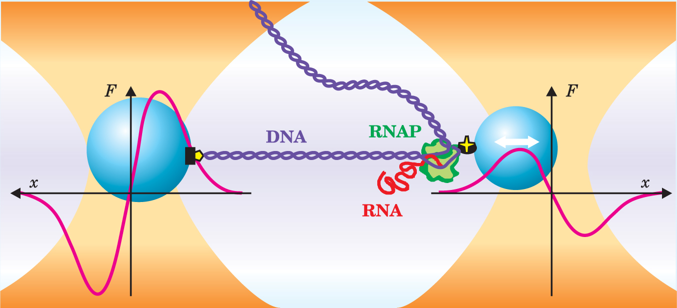 Figure 1. Pulling apart two trapped beads under constant force yields the size of the steps RNA polymerase makes along DNA as it produces RNA. Constant force is maintained because the trapped bead on the right is in a regime where force does not depend on position.