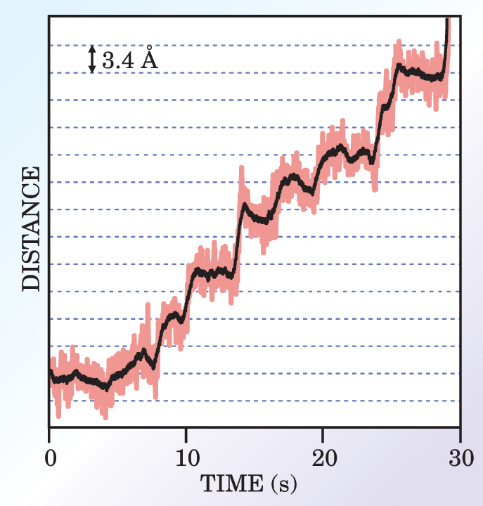 Figure 2 shows a typical data set. Applying a constant force of 18 pi-conewtons and recording the transcription at an average rate of 1 base per second produces a trace with distinct steps. Combining several traces and analyzing the distribution yields a clear peak with a mean step of 3.7 ± 0.6 Å, comparable to the mean separation between bases. Evidently, evolution picks the simplest transcription scheme: transferring the smallest units of genetic information, the bases, one by one, rather than in bunches.