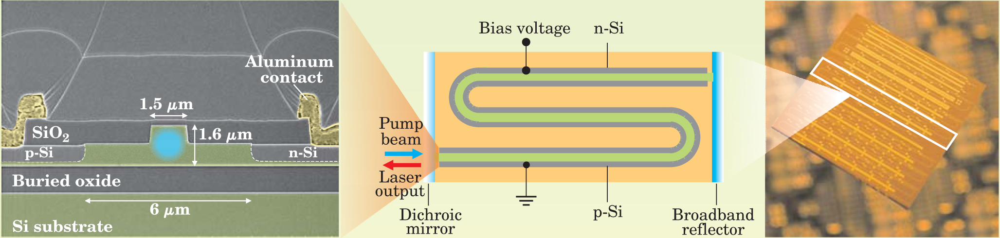 Figure 1. A silicon Raman laser consists of a “rib” waveguide made from crystalline silicon enclosed in a sheath of silica (SiO2) cladding and pumped by a separate laser. The figure shows on-edge (left) and lateral (middle) views of the waveguide. Partially reflective mirrors form a resonator cavity tuned to the frequency of the Raman emission. The pump light (blue) exploits the nonlinear Raman effect, provided the pump is intense enough to couple to the material’s optical phonons and emit stimulated, coherent scattered waves back through the waveguide. But if too intense, the pump light also excites electrons and holes into the lattice, which kills the Raman gain. An electric field applied across n- and p-doped regions sweeps them away. At far right, eight Si-based Raman lasers sit on a 16 mm by 16 mm chip.