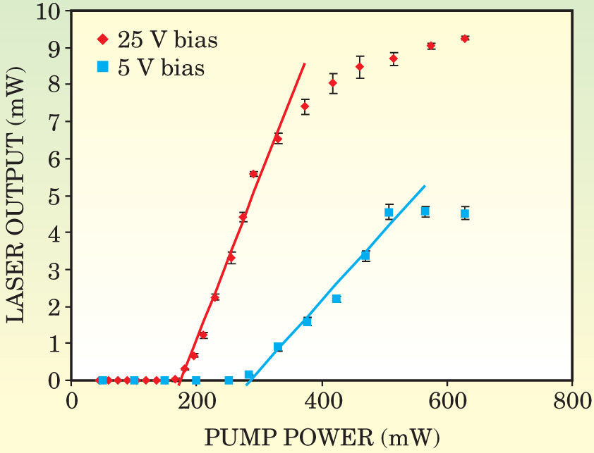 Voltage applied to the n-doped silicon relative to the p-doped region creates an electric field that sweeps away most of the electrons and holes formed by the high pump-beam intensity. The configuration allowed the team to pump the crystal continuously from a diode laser at 1.55 µm without saturating the silicon with charge carriers. And it produced a similar continuous-wave emission at a Stokes wavelength of 1.69 µm. Figure 2 illustrates how biasing the diode influences the threshold for stimulated Raman scattering.