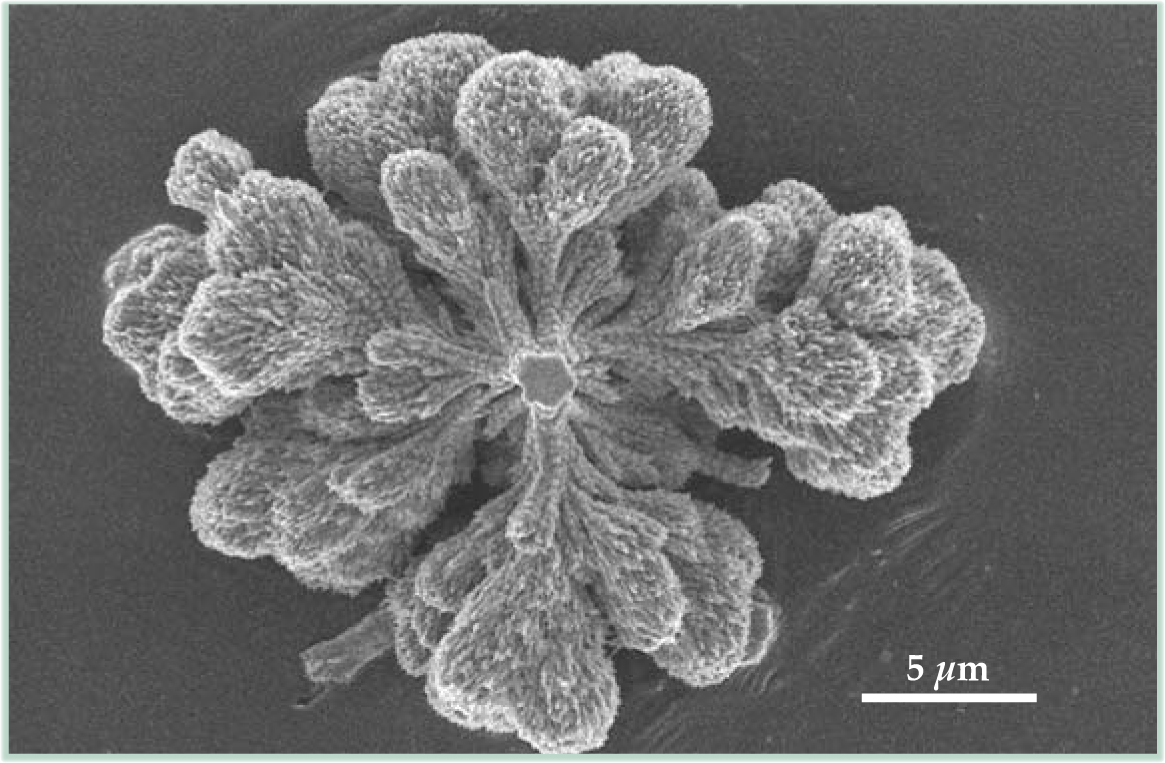 Using video microscopy, the team identifies specific stages of growth. Initially the carbonate crystal grows as a fragmenting, dendritic stalk whose head resembles a cauliflower, as in figure 1. Then, once the pH drops enough for cyclic coprecipitation to be established (within a day, typically), the biomorph grows through pulses of nucleation events to form the carbonate nanoparticles. At that stage, for reasons unexplained by the team’s mechanism, two-dimensional sheets emerge from the 3D cauliflower. Each sheet, consisting of partially aligned nanoparticles, grows radially outward, often to hundreds of square microns, until it curls up at points along its edge like a scroll. Those curls carve out smoothly curved borders that can become shaped like cardiods or interact to spawn filaments like those in figure 2.