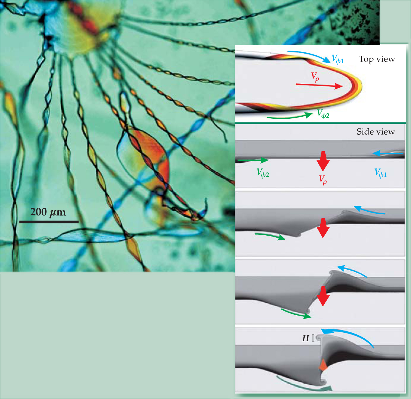 Figure 2. Helical filaments emerge from cusps formed when two counterpropagating curling fronts meet each other along the edge of a two-dimensional sheet. The radial velocity v p of the advancing sheet, the azimuthal velocities v φ1 and v φ2 of the curls, and their height H characterize emergent patterns. If the curls have opposite handedness as they approach (top view), the sheet abruptly ends at the cusp. But curls with the same handedness (side view) twist into filaments.