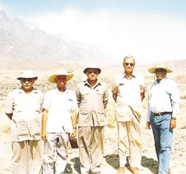 Abdul Qadeer Khan (second from right) and other scientists from the Khan Research Laboratories stand in front of Ras Koh Hills nuclear test site moments after Pakistan’s 1998 nuclear tests.