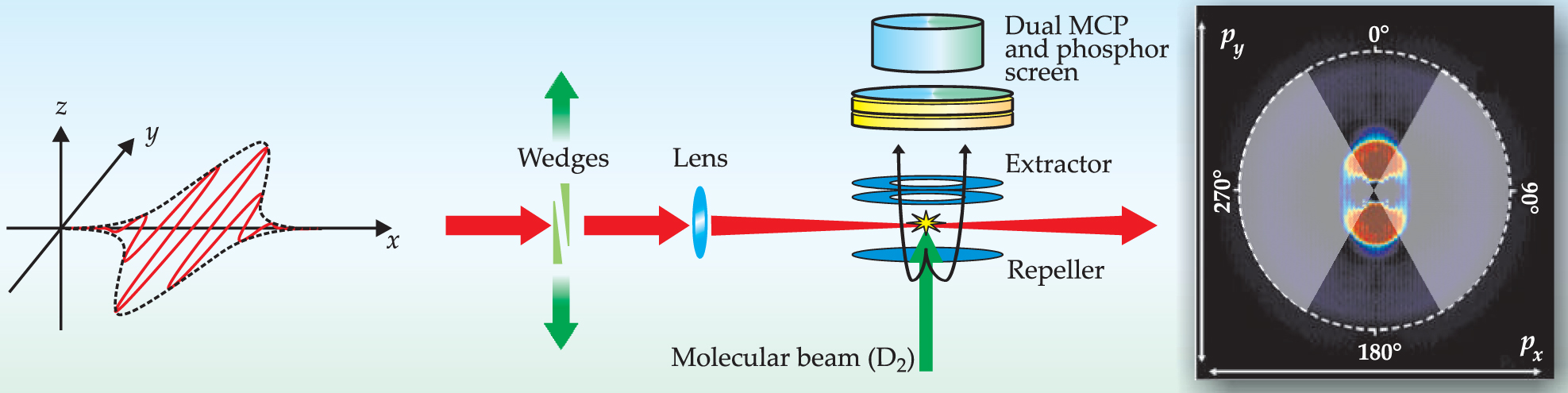 Laser pulses pass first through a pair of glass wedges whose separation changes the CEP and then through a lens whose focus intercepts the beam of D2 molecules. What happens when a pulse hits a molecule depends on the molecule’s orientation with respect to the laser’s polarization. If the two axes are aligned, the laser ionizes the molecule and excites it into a state from which it splits into a D atom and a D+ ion. The ion is accelerated toward a microchannel plate detector, whose plane is parallel to the polarization. The ion’s position, along with elementary electrostatics, yields the ion’s momentum.