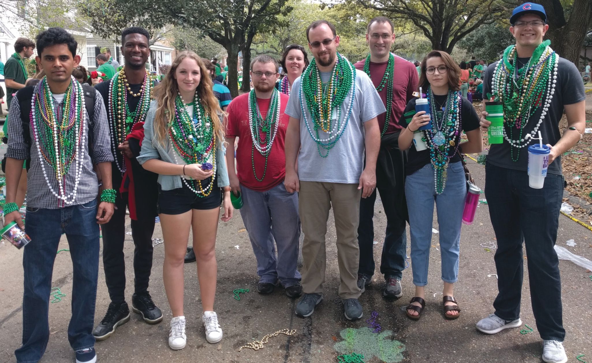 Prospective graduate students at the Louisiana State University physics department’s 2017 open house, which coincided with a local St Patrick’s Day parade. Now working on their physics PhDs at LSU are Tej Poudel Chhetri (far left), Thomas Ruland (red shirt), Frank McKay (light blue shirt), and Scott Mullen (maroon shirt). Madeleine Miora (second from right) earned her master’s at LSU; the other students went to other universities.
