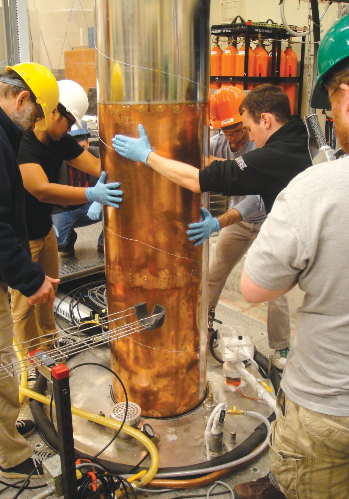 Members of the Axion Dark Matter Experiment lower the deep cryogenic detector into the bore of a superconducting magnet. Shown are ADMX lead scientist Leslie Rosenberg (yellow hat), graduate students Nick Du (white hat) and Michael Hotz (green hat), and Cliff Plesha (no hat) and another undergraduate (orange hat), all of the University of Washington.