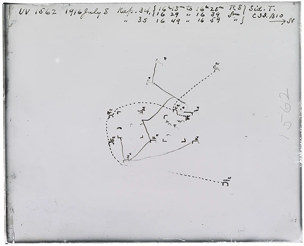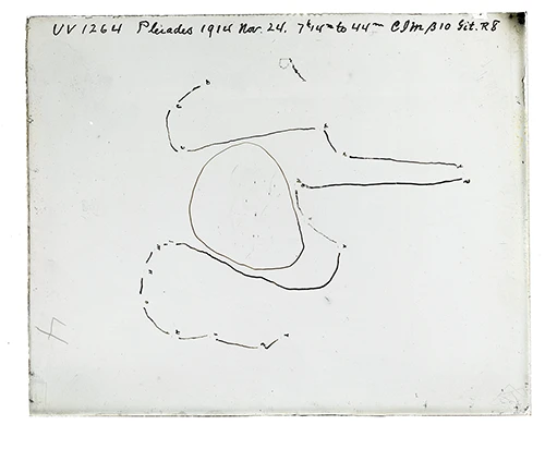 In her 1916 master’s thesis, Harriet Parsons provided the photovisual magnitudes of 111 stars in the Pleiades cluster, which she obtained through an analysis of 20 plates measured with a microphotometer. This plate was one of two taken with parallel wire grating placed over the objective lens of the telescope’s camera. The first step in the reduction of her measurements required Parsons to apply calibration corrections. She then converted the corrected scale readings into relative magnitudes. Finally, she reduced those relative magnitudes into absolute magnitudes on some definite scale. In two further tables she provided various notations from published sources and a comparison of her own work with magnitude determinations by other astronomers. (Courtesy of the Yerkes Glass Plate Collection, Hanna Holborn Gray Special Collections Research Center, University of Chicago Library.)