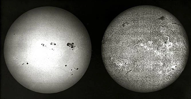 These images of the Sun by Mary Calvert illustrate the differences between a direct photograph (left) and a spectroheliogram (right). A spectroheliogram captures solar emissions at a single wavelength, characteristic of a specific atom or ion such as calcium. The spectroheliograph instrument was originally developed by Yerkes Observatory founder George Ellery Hale to explore the effects of magnetic fields. Although Hale became famous for his magnetic field research at Mount Wilson Observatory near Pasadena, California, the research team at Yerkes also continued a program of spectroheliograph photography and research. (Courtesy of the University of Chicago Photographic Archive, apf6-02306, Hanna Holborn Gray Special Collections Research Center, University of Chicago Library.)