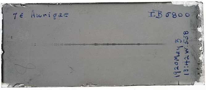 Plate IB5800 was taken by Dorothy Block on 3 May 1920. The spectrogram of the binary star Epsilon Aurigae spans much of the 10 cm length of the plate, and the spectrum is approximately 1 mm thick. This plate and others that were measured by Block, Evelyn Wornham Wickham, and other members of the Yerkes staff—both men and women—helped inform a 1932 article by Edwin Frost, Otto Struve, and C. T. Elvey that contained detailed information about the star’s radial velocity and line intensities. The binary stellar system had attracted attention—and still does—because of its unusually long orbital period and eclipse duration, the evolutionary status of the supergiant primary star, and the invisibility of the secondary star. The research of the Yerkes team was at the cutting edge of astrophysics in the early 20th century. (Courtesy of the Yerkes Glass Plate Collection, Hanna Holborn Gray Special Collections Research Center, University of Chicago Library.)