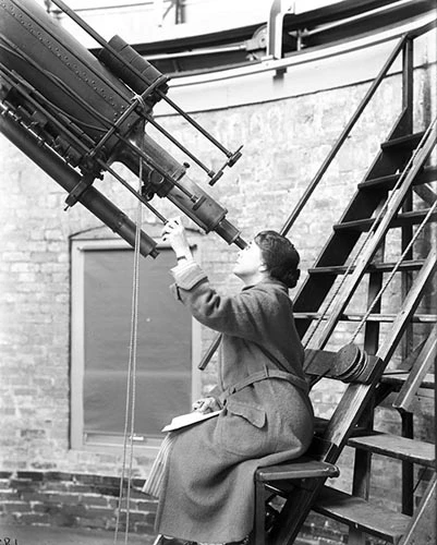 Mary Calvert operates the Kenwood 12-inch refracting telescope in 1926. Calvert is known for finishing her uncle E. E. Barnard’s A Photographic Atlas of Selected Regions of the Milky Way, which was published in 1927, four years after Barnard’s death. She also finished many other publications in Barnard’s name after his passing, receiving acknowledgement for her editorial work rather than for her authorship. But Calvert was an accomplished astronomer in her own right, a fact that was partially recognized by her 1927 promotion to assistant at the Yerkes Observatory. In 1934 she authored the Atlas of the Northern Milky Way with Frank Elmore Ross. (Courtesy of the University of Chicago Photographic Archive, apf6-01280, Hanna Holborn Gray Special Collections Research Center, University of Chicago Library.)