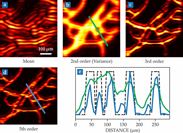 Superresolution photoacoustic imaging. In a computer simulation of a complex microvasculature structure filled with randomly moving light-absorbing particles, researchers took 50 000 photoacoustic snapshots of the structure and reconstructed it, pixel by pixel. Shown here are (a) the mean of the acoustic intensity; (b) the variance—that is, the second-order moment or square of the standard deviation of random fluctuations between images; and (c,d) higher-order moments. The increase in resolution scales as the square root of the order number. (e) Green and blue curves plot the cross sections of absorption-intensity maps in panels b and d. The dashed curve shows the locations of the simulated vessels. (Adapted from ref.