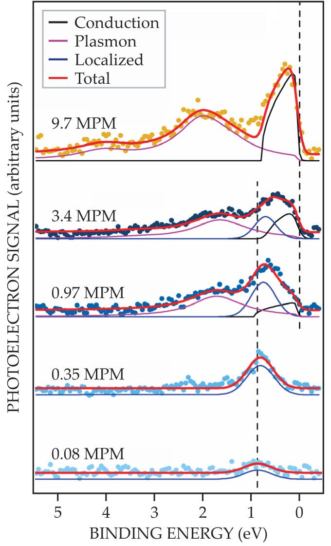 The fraction of isolated electrons needed to account for the observed spectra decreases with increasing metal concentration. At the highest concentration, 9.7 MPM, the spectrum is entirely described by the free-electron gas model, and the conduction-band peak has the predicted sharp edge at the Fermi energy. A plasmon peak in the visible range accounts for the solution’s bronze, rather than silver, appearance. The 9.7 MPM spectrum’s shape closely mirrors that of 50–50 sodium–potassium, a more standard liquid metal that the researchers tested for comparison.