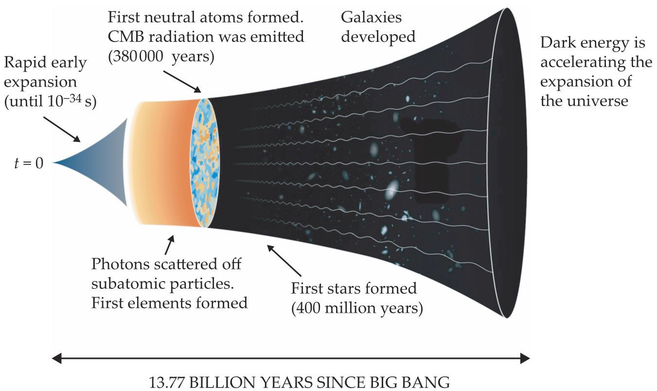 James Peebles laid out a framework for the evolution of the universe. Models and observations based on his work continue to refine the predictions about key stages of the universe’s past, some of which are shown here. (Nobel Prize organization.)