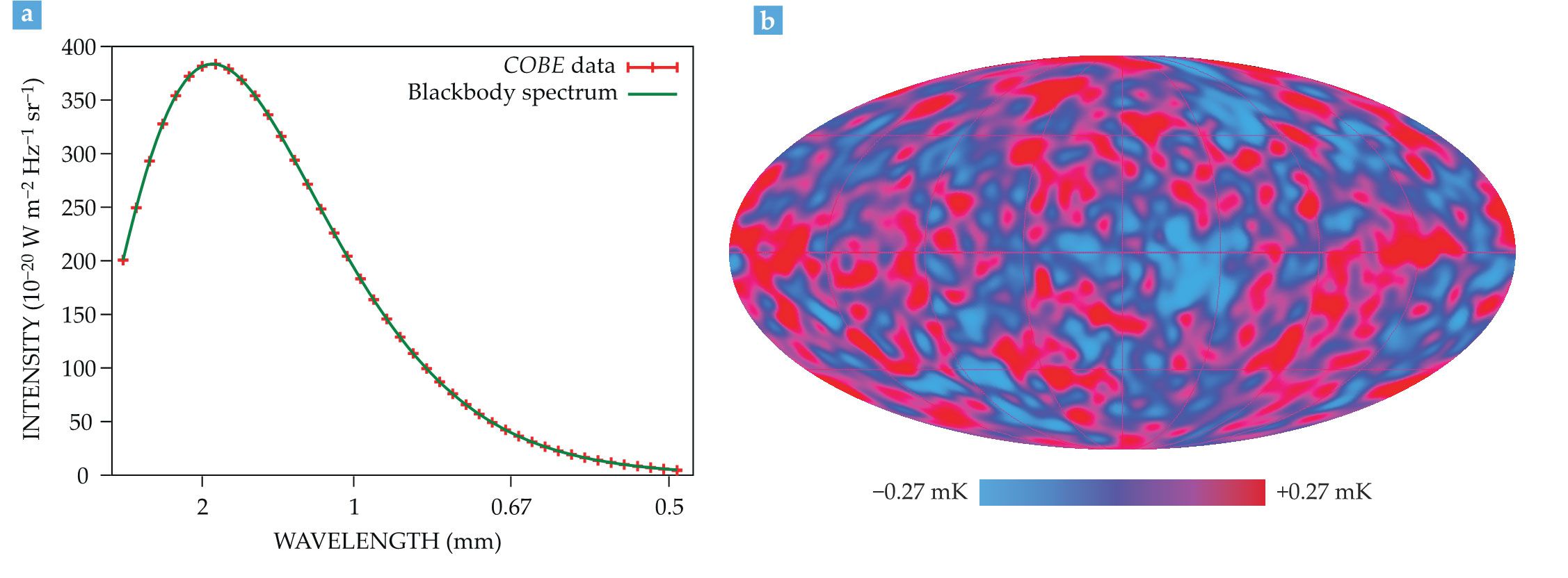 Thermal radiation from the early universe, as measured by NASA’s Cosmic Background Explorer (COBE). (a) The Far Infrared Absolute Spectrophotometer measured the cosmic microwave background (CMB) at wavelengths from 0.1 to 10 mm. The solid curve shows a blackbody spectrum, at a temperature of 2.725 K, as predicted by the Big Bang theory. (b) The Differential Microwave Radiometer measured fluctuations in the CMB radiation at a level of 1 part in 100 000. This sky map, created from the first two years of COBE data, provided the first view of the anisotropies in the CMB. Those variations gave rise to the structures seen today. (Courtesy of NASA’s Goddard Space Flight Center.)