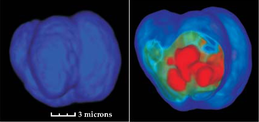 Robust methods for early cancer detection may be developed from tomographic imaging of single cells. These images show the nuclear surface (left) and a slice from the reconstructed isotropic three-dimensional image (right); DNA density increases from green to red. The images are formed with computed tomography, but whereas clinical CTs use an x-ray source and detector, here the source was white light and the detector a microscope equipped with a CCD camera.