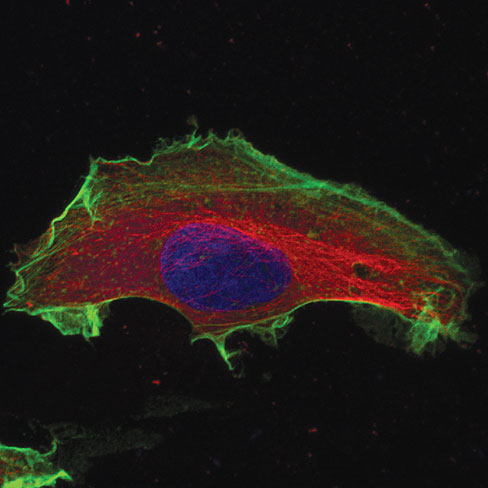 Researchers at the Johns Hopkins University Physical Sciences–Oncology Center are working to identify proteins that control the process of metastasis. In this image, a human fibrosarcoma cell has been stained for microtubule cytoskeleton (red), actin cytoskeleton (green), and nucleus (blue).