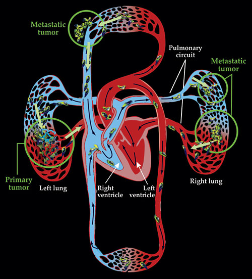 Human vascular system schematic shows blood flow, the travel patterns of circulating tumor cells (CTCs), and CTC clusters. Known as circulating tumor microemboli, the clusters have migrated into the bloodstream from the primary cancer tumor in the left lung and formed metastatic tumors in the blood vessels and the right lung. The presence of these disease-derived cells throughout the course of the disease suggests certain steady-state distributions and frequent stopovers of the cells at hospitable sites.