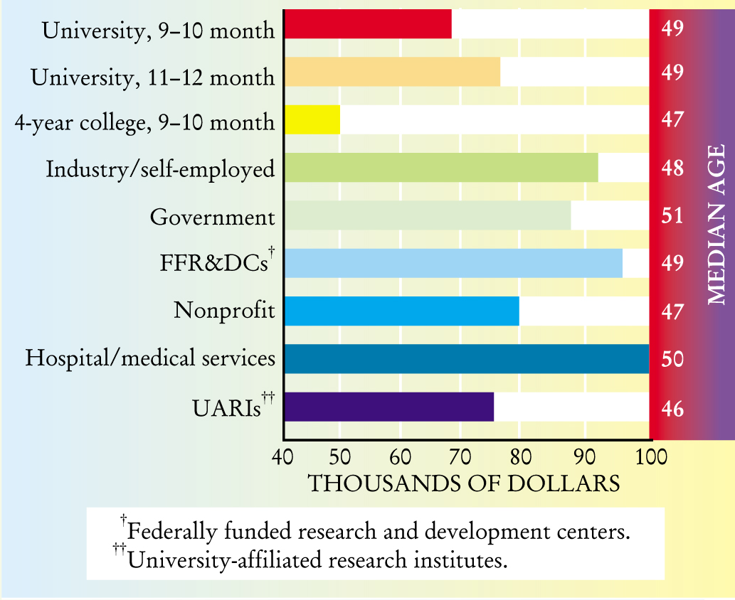 Median PhD salaries by major employment sector, 2000.