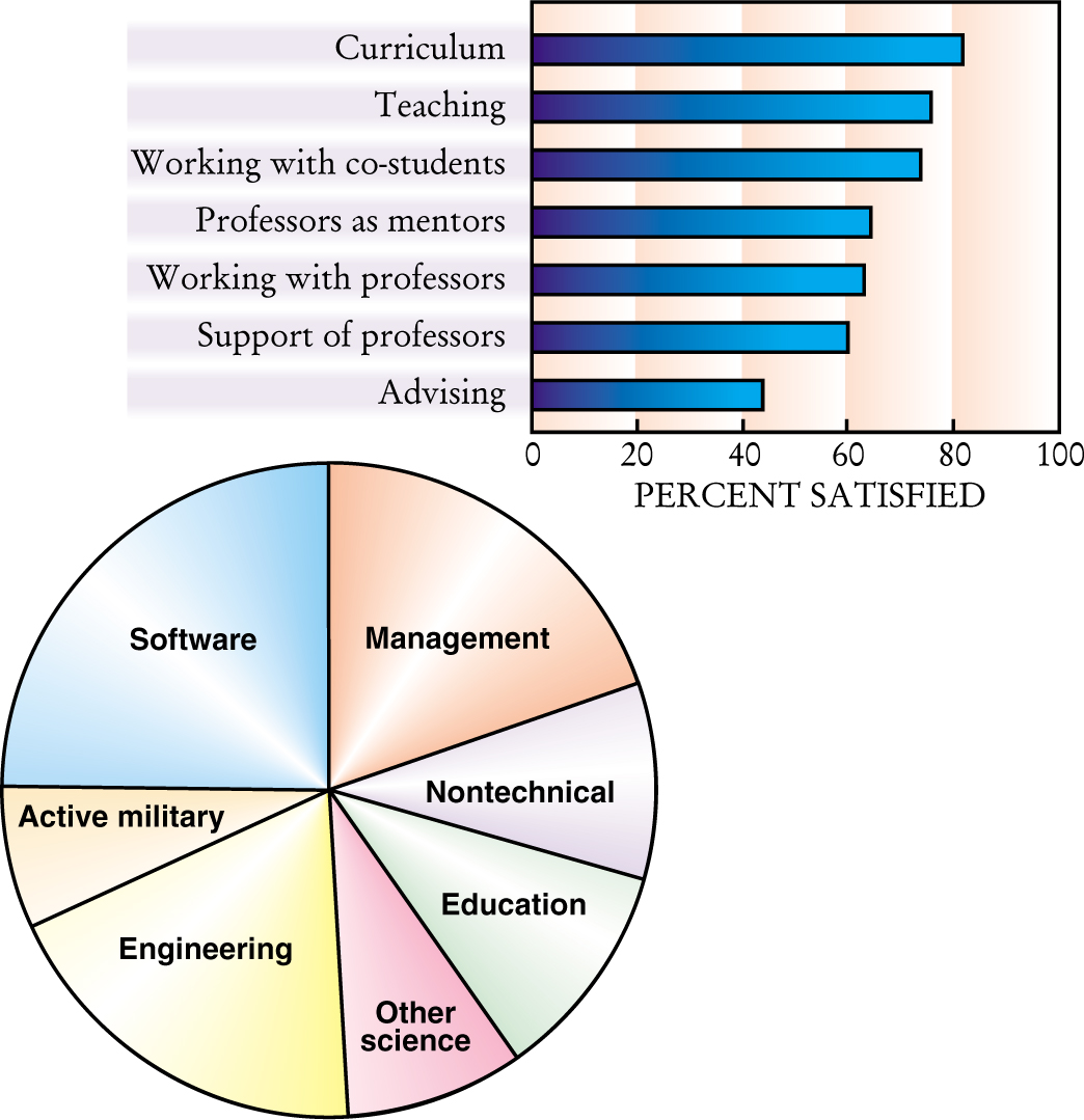 Degrees of satisfaction: Five to eight years after graduation, physics bachelors who hold no additional degrees and are not primarily students work in many employment sectors (pie chart) and, looking back, say they are satisfied with various aspects of their degree programs (bar chart).