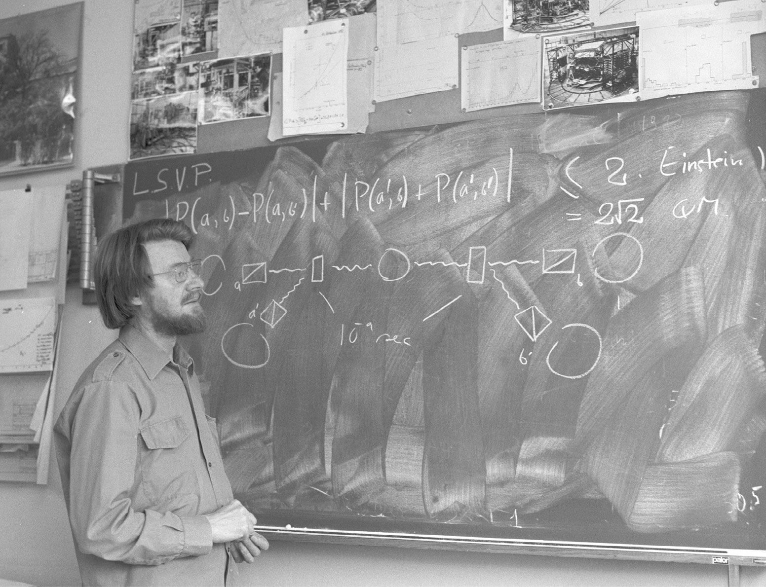 John Bell, in his CERN office in 1982. The drawing on the blackboard depicts measurements of the correlations between the spins or polarizations of an entangled pair of particles. The equation at the top is the upper bound expected in local-realist models, which is lower than the bound for quantum mechanics (QM). (Courtesy of CERN, CC BY 4.0
