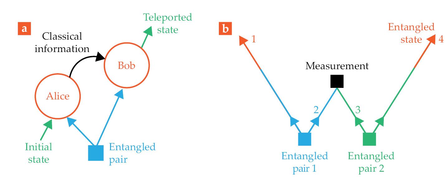Entanglement enables useful tricks for quantum technologies. (a) Quantum teleportation replicates a quantum state that starts with Alice. She and Bob each receive one particle of an entangled pair. Alice then does a joint measurement on the initial state and her entangled particle, and she sends Bob classical information about the outcome. With that information, Bob can then apply a local transformation to his particle to replicate the exact state of Alice’s initial particle. (b) Entanglement swapping entangles particles that have never been in close proximity. Two separate entangled pairs are sent out: particle 1 to Alice, particle 4 to Bob, and particles 2 and 3 to a central location. A joint measurement on the central particles and communication of the result leaves distant particles 1 and 4 entangled. (Figure by Freddie Pagani.)