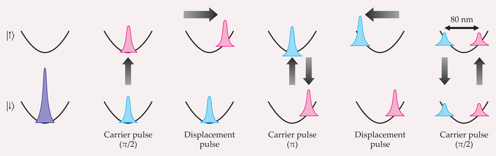 Figure 1. A laser-cooled ion trapped in a harmonic potential well can be placed in two locations at once by entangling its vibrational and hyperfine states. A π/2 carrier pulse prepares the ion’s wavefunction in a superposition of the ∣↓〉 and ∣↑〉 hyperfine states, and a polarized displacement pulse selectively excites the ∣↑〉 wavepacket into oscillatory motion. A π carrier pulse then flips the wavepackets’ hyperfine states so that the next displacement pulse sets the second packet in motion. To detect the superposition, each packet must first be prepared, with a final carrier pulse, into a superposition of hyperfine states. When the wavepackets oscillate perfectly out of phase, the interpacket spacing can exceed 80 nm. (Adapted from ref.